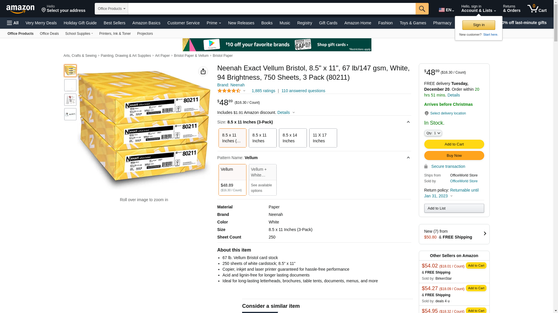 Neenah Exact Vellum Bristol, 8.5" x 11", 67 lb/147 gsm, White, 94 Brightness, 750 Sheets, 3 Pack (80211)