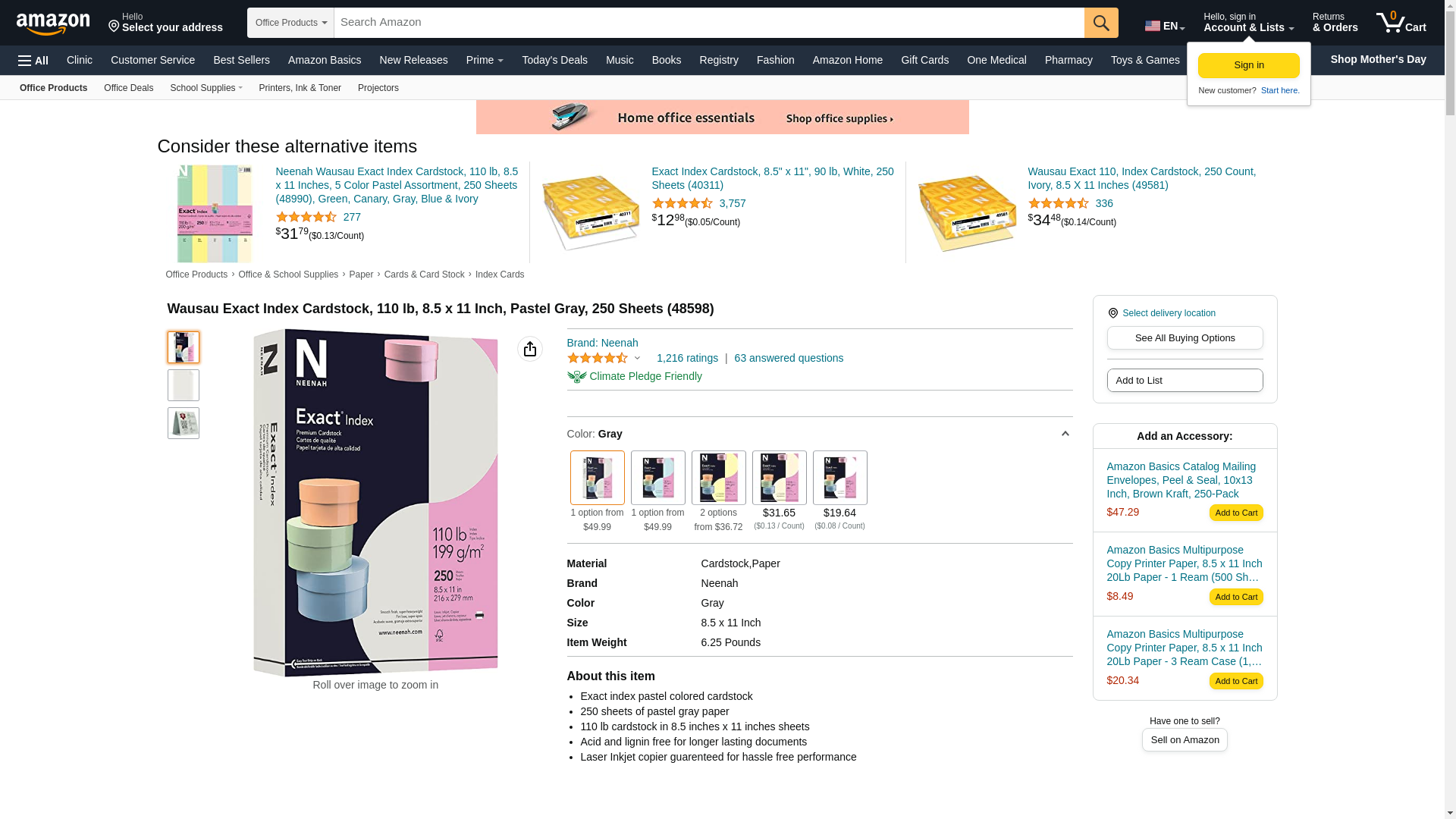 Wausau Exact Index Cardstock, 110 lb, 8.5 x 11 Inch, Pastel Gray, 250 Sheets (48598)