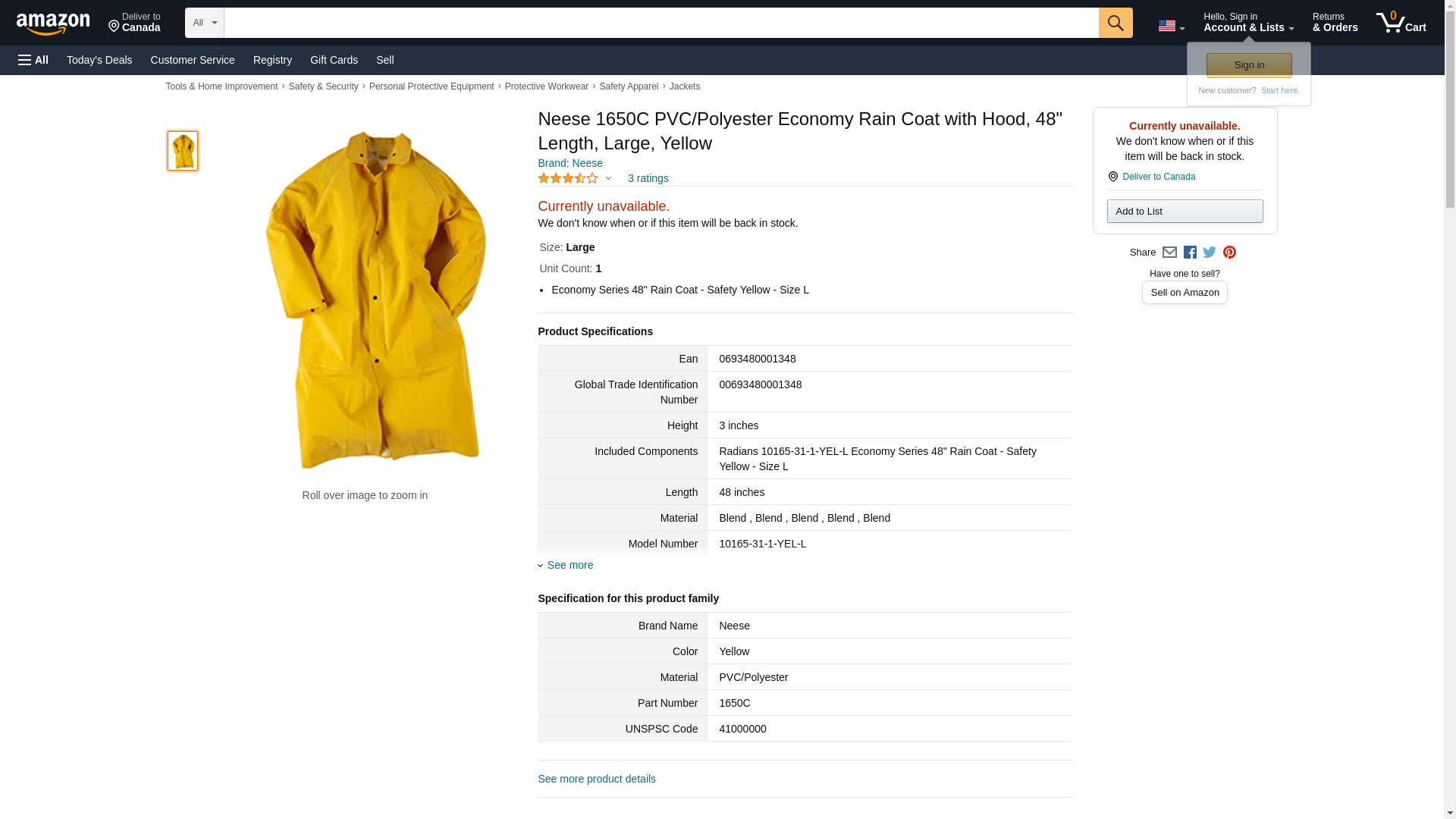Neese 1650C PVC/Polyester Economy Rain Coat with Hood, 48" Length, Large, Yellow