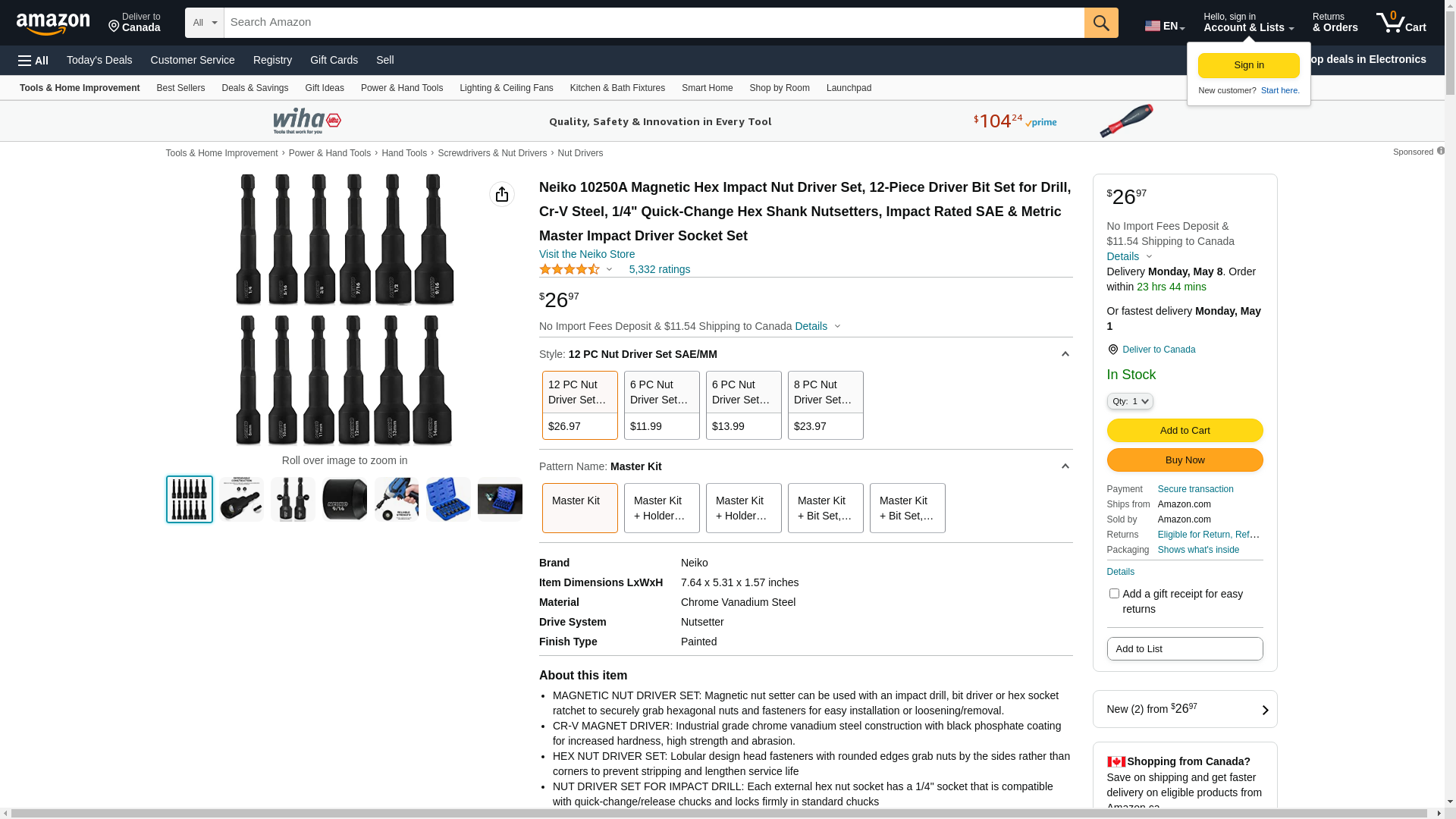 Neiko 10250A Magnetic Hex Nut Driver Master Kit, Cr-V Steel | 1/4" Quick-Change Hex Shank | Impact Rated SAE & Metric | 12-Piece Set(Pack of 12)