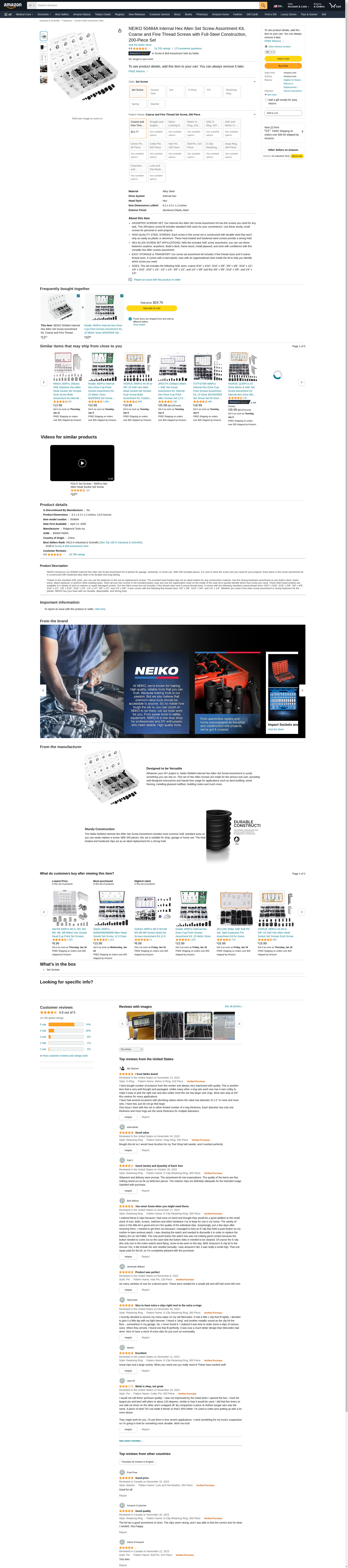 NEIKO 50484A Internal Hex Allen Set Screw Assortment Kit, Coarse and Fine Thread Screws with Full-Steel Construction, 200-Piece Set