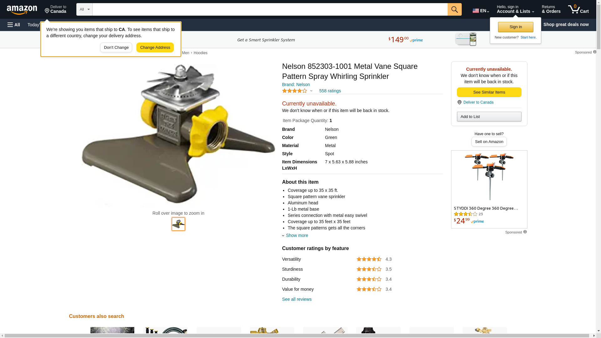 The Nelson whirling sprinkler is ideal for new lawns or spot watering with its gentle spray. This Whirling Sprinkler by Nelson has a square spray patterns that is 35 feet X 35 feet. It has an all metal base and aluminum head for a long lasting and dependable life. Features and Benefits: Has a metal base, head and coupling, Has a spray radius of 35 feet X 35 feet, Square spray pattern, Great for spot watering or newly seeded lawns.