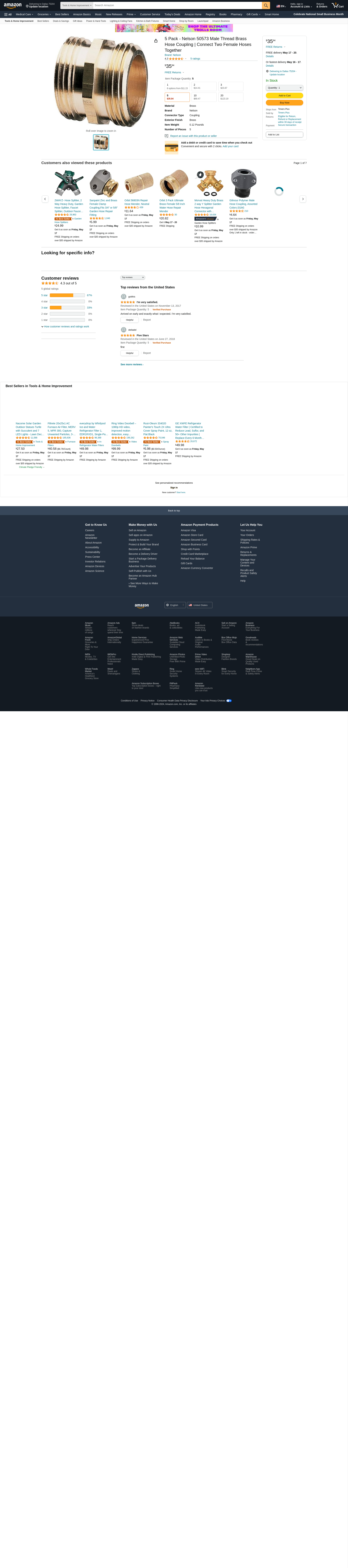 5 Pack - Nelson 50573 Male Thread Brass Hose Coupling | Connect Two Female Hoses Together