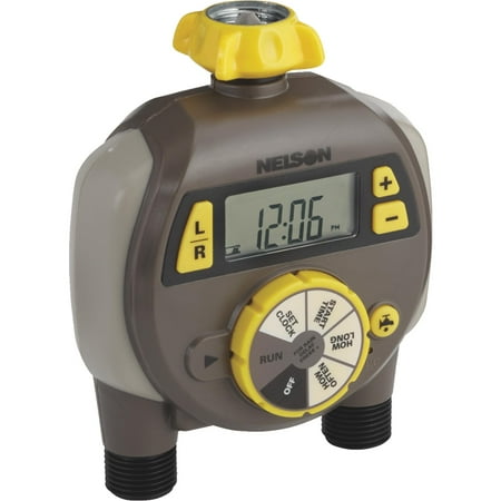 The Nelson electronic timers are easy to use and great for saving water. This Nelson Electronic Water Timer is used to help program when you want to water for lawn and for how long. It is great for people who want to set their sprinklers up and then not have to worry about turning them on and off everyday. Features and Benefits: Dual port electronic water timer, the valve will close when the timer's batteries get low to avoid flooding, Can water for 360 minutes or less, Requires 2 AA batterie...