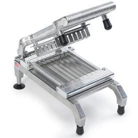 Cut your labor with the new Easy Chicken Slicer with Scalloped Blades. The ingeniously simple design features a unique assembly of unsharpened blades that make quick work of cooked chicken breast either breaded or grilled. Compared to the conventional knife-in-hand alternative, the Easy Chicken Slicer performs with superior speed, consistency and, above all, safety—with virtually no training required! It’s rugged, compact and portable with aluminum and stainless steel construction that lasts for years in the commercial kitchen. Cleanup is a breeze because, while disassembly is as easy as pulling a pin, the pusher block and the scalloped blades are also specially designed to minimize lodging of the chicken meat. Model: 55975-1SC. Description: 3/8" slice. Dimensions: 6 3/4"W x 13 1/2"D x 16 1/2"H