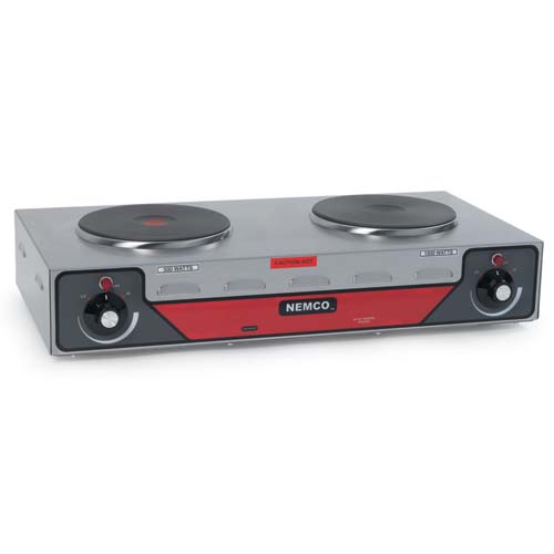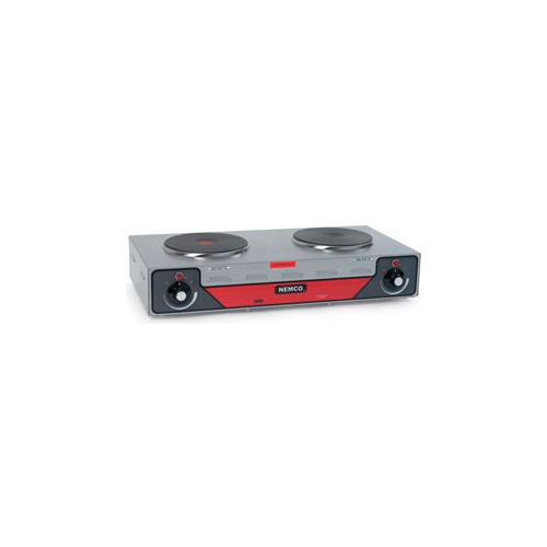 Nemco's Hot Plate, horizontal double burner, 5-1/8" x 24-1/8" x 13-1/2", brushed stainless steel construction, cast iron alloy burners, six position temperature control, built in thermo protection, .5kw (left), 1.5 kw (right), 120v/60/1ph, 2000 watts, 16.7 amps, cord & NEMA 5-20P.