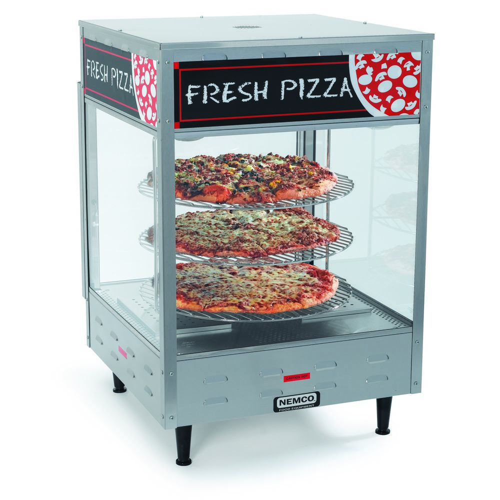 Nemco's Pizza Merchandiser, 33-7/8" x 22-1/2" x 22-1/2", rotating, 3 tier, 18" diameter racks, stainless steel construction, tempered glass case, illuminated interior, water reservoir, thermostat control up to 200°F, includes signage, 120v/60/1ph, 1480 watts, 12.4 amps, NSF.