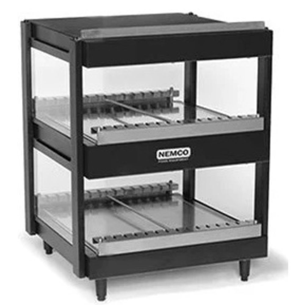 Finally. A food merchandising solution that can really showcase hot foods by holding them at optimum temperatures for hours. Each shelf has its own top and bottom heating with independent thermostats to accommodate variable temperature settings. Features also include a lighted merchandising area, tempered glass sides, adjustable divider rods for easy organization of food product, and an overall stainless-steel construction as part of NEMCO's trademark commercial-grade durability design style. Powder coating is also available. Plus, ask about custom graphic signage too. Weights & Dimensions Depth 19-1/2 in Width 24 in Height 14-25/64 in Product Details Package Quantity 1 Voltage 120 v Amperage 4.8 A Wattage 580 w Color Family Gray