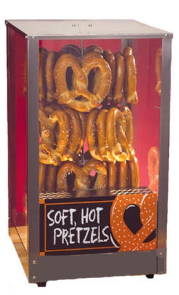 - Attractive contemporary merchandisers with 2-tiered racks hold dozens of pretzels.