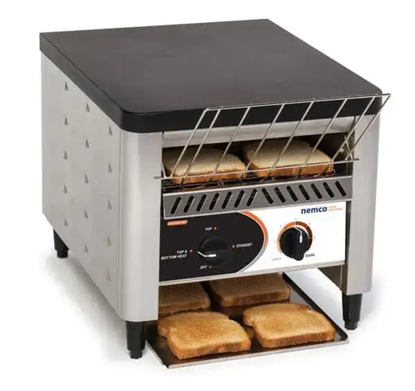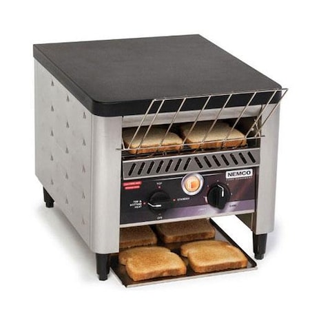 Nemco's Conveyor Toaster, electric, 2-slice, 300 pieces/hour capacity, 4-position rotary switch, removable crumb tray, 2-1/2" adjustable legs, bronze conveyor, stainless steel construction, black textured powder-coat top, 120v, 1660 watts, 13.8 amps, cETLus, NSF.