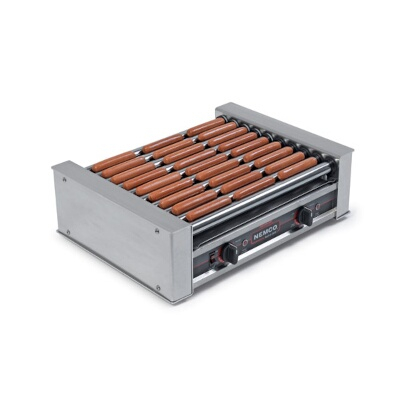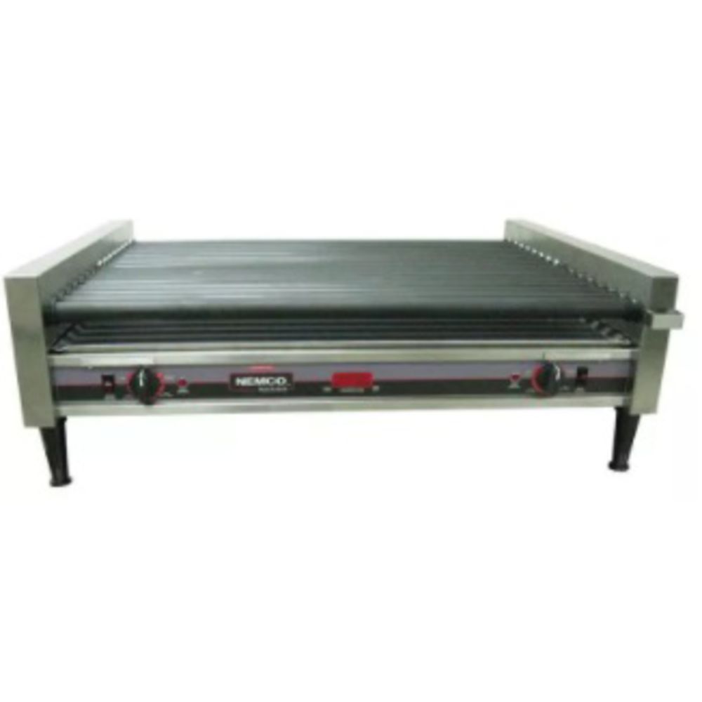 This hot dog roller grill from Nemco® features a digital readout that displays the approximate food temperature of the product for both zones. The 360° roller rotation prevents residue buildup while individual roller heating elements ensure heating consistency. The removable drip pan makes for easy cleaning and the infinite controls offer versatile temperature control. Front and rear rollers have their own heat controls. This feature permits shutting off one section during non peak hours.Model #: 8050SX-RCGripsIt coating on rollers - makes clean up easy for those sugary coated products and breakfast itemsRugged stainless steel constructionDigital readout that displays the approximate food temperature of the product for both zonesSimplest installation - plugs into any outlet with corresponding voltageEasy to see color coded grease seals to identify front (black) and rear (white) rollers Rollers rotate at a complete 360° turn by means of a roller sprocket motor sprocket and chainEnd bearing and grease barrier double protect against grease seepageControl cover4" adjustable legsHolds 50 hot dogs