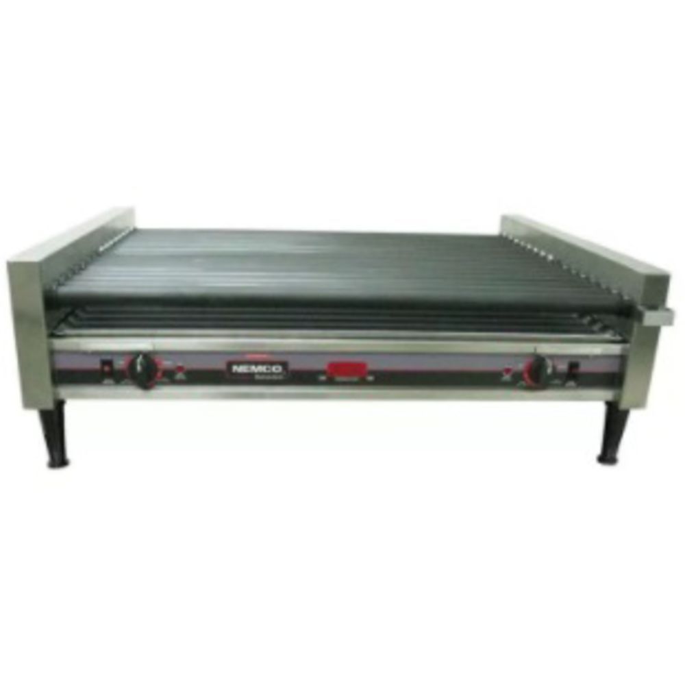 This slanted hot dog roller grill from Nemco® features a digital readout that displays the approximate food temperature of the product for both zones. The 360° roller rotation prevents residue buildup while individual roller heating elements ensure heating consistency. The removable drip pan makes for easy cleaning and the infinite controls offer versatile temperature control. Front and rear rollers have their own heat controls. This feature permits shutting off one section during non peak hours.Model #: 8075SXW-SLT-RCGripsIt coating on rollers - makes clean up easy for those sugary coated products and breakfast itemsRugged stainless steel constructionSlanted rollers for effective merchandisingDigital readout that displays the approximate food temperature of the product for both zonesSimplest installation - plugs into any outlet with corresponding voltageEasy to see color coded grease seals to identify front (black) and rear (white) rollers Rollers rotate at a complete 360° turn by means of a roller sprocket motor sprocket and chainEnd bearing and grease barrier double protect against grease seepageControl cover4" adjustable legsHolds 75 hot dogs