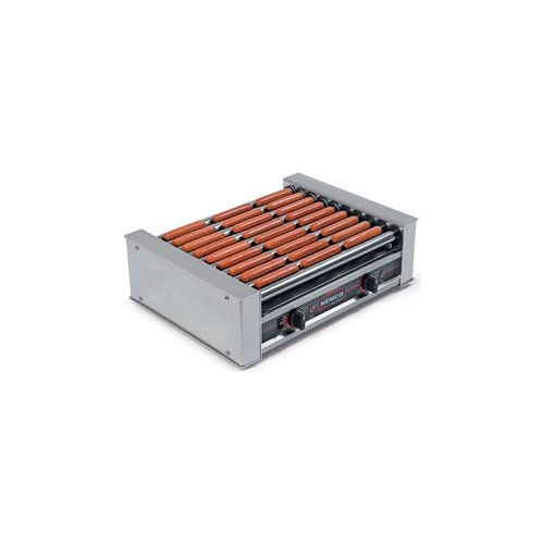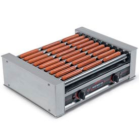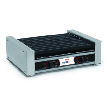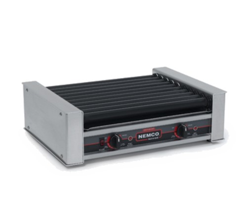 Nemco's Roll-A-Grill Hot Dog Grill, 10 GripsIt coated rollers, capacity 27 hot dogs-540 per hour, aluminum and stainless steel construction, (2) 7 setting heat control switches, one motor, 950 watts, NEMA 5-15P, 120v, 7.9 amps, NSF, cETLus.