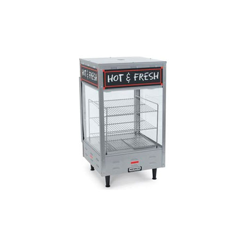 Nemco's Heated Merchandiser, 18-1/2"W x 18-1/2"D x 33-7/8"H, stainless steel construction, tempered glass case, three 15" square shelves, illuminated interior, water reservoir, thermostat control up to 200°F, 120v/60/1ph, 1480 watts, 11.9 amps, NSF.