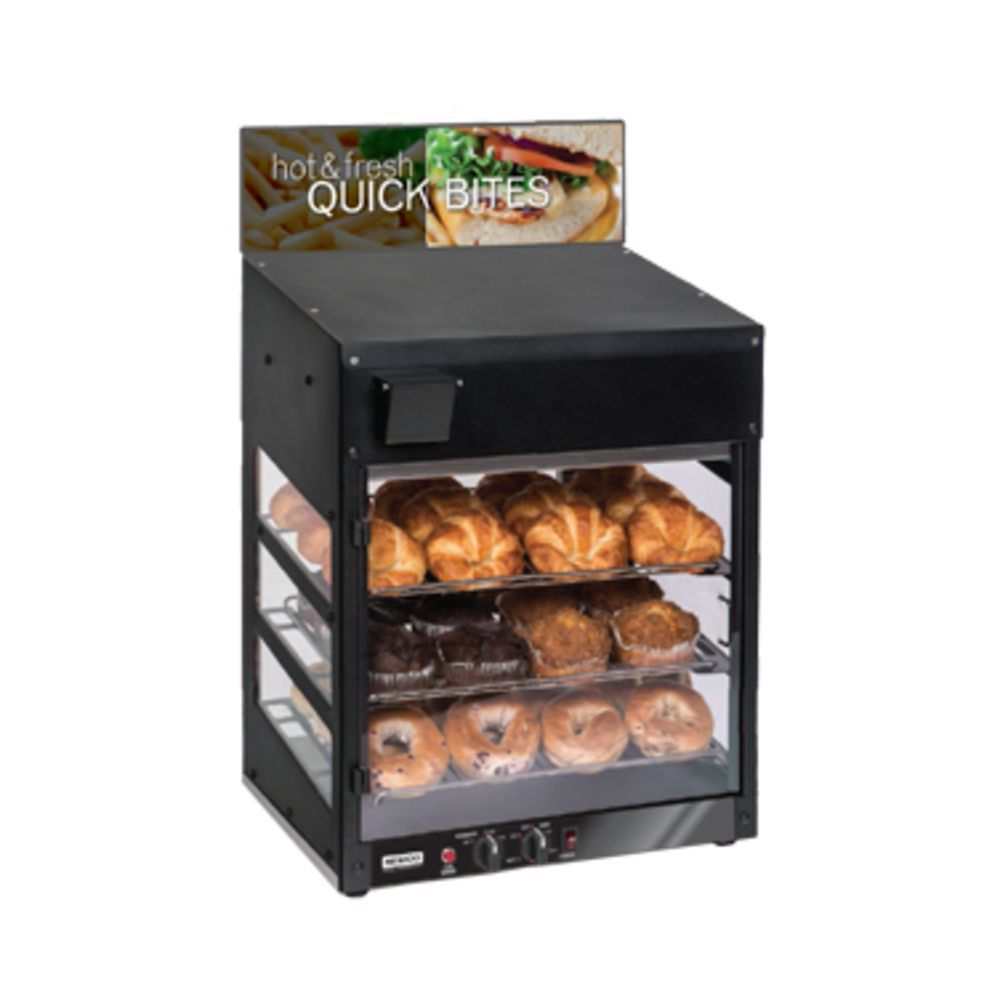 Nemco 6475 Heated Merchandiser countertop 20W x 17D x 26H (3) angled wire rack shelves interior lighting tempered glass panels graphics manual temperature and humidity controls water reservoir stainless steel and powder coat construction 826 watts 120v601-ph