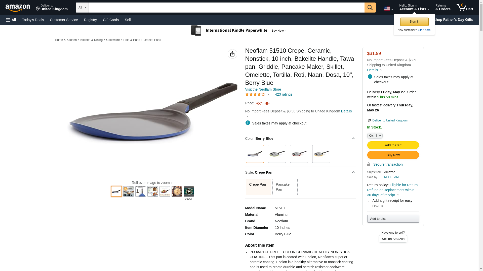 Neoflam 51510 Crepe, Ceramic, Nonstick, 10 inch, Bakelite Handle, Tawa pan, Griddle, Pancake Maker, Skillet, Omelette, Tortilla, Roti, Naan, Dosa, 10", Berry Blue