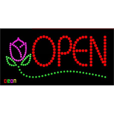 <b>12"x24" Neon By Deon Rose Flowers Available LED Open Sign w/Flashing Controller</b>: <ul> <li>Customizable</li> <li>12 month limited warranty on parts and labor</li> <li>Uses attractive quality translucent black backing, not ABS plastic</li> <li>Very light weight</li> <li>Highly efficient. Uses up 90% less energy than glass neon</li> <li>Flashing & Animated LED Display</li> <li>Excellent visibility. (including when in direct sunlight)</li> <li>Includes hanging chain</li> <li>Included a 110V AC Adapter</li> <li>Animation/Flashing turned on/off is very simple, via a switch</li> </ul>