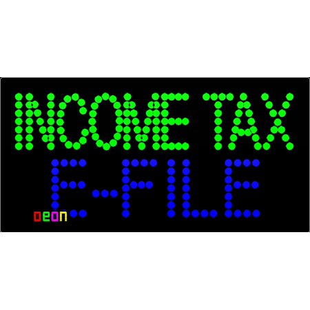 <b>12"x24" Neon By Deon Income Tax E-File LED Sign w/Flashing Controller</b>: <ul> <li>Customizable</li> <li>12 month limited warranty on parts and labor</li> <li>Uses attractive quality translucent black backing, not ABS plastic</li> <li>Very light weight</li> <li>Highly efficient. Uses up 90% less energy than glass neon</li> <li>Flashing & Animated LED Display</li> <li>Excellent visibility. (including when in direct sunlight)</li> <li>Includes hanging chain</li> <li>Included a 110V AC Adapter</li> <li>Animation/Flashing turned on/off is very simple, via a switch</li> </ul>