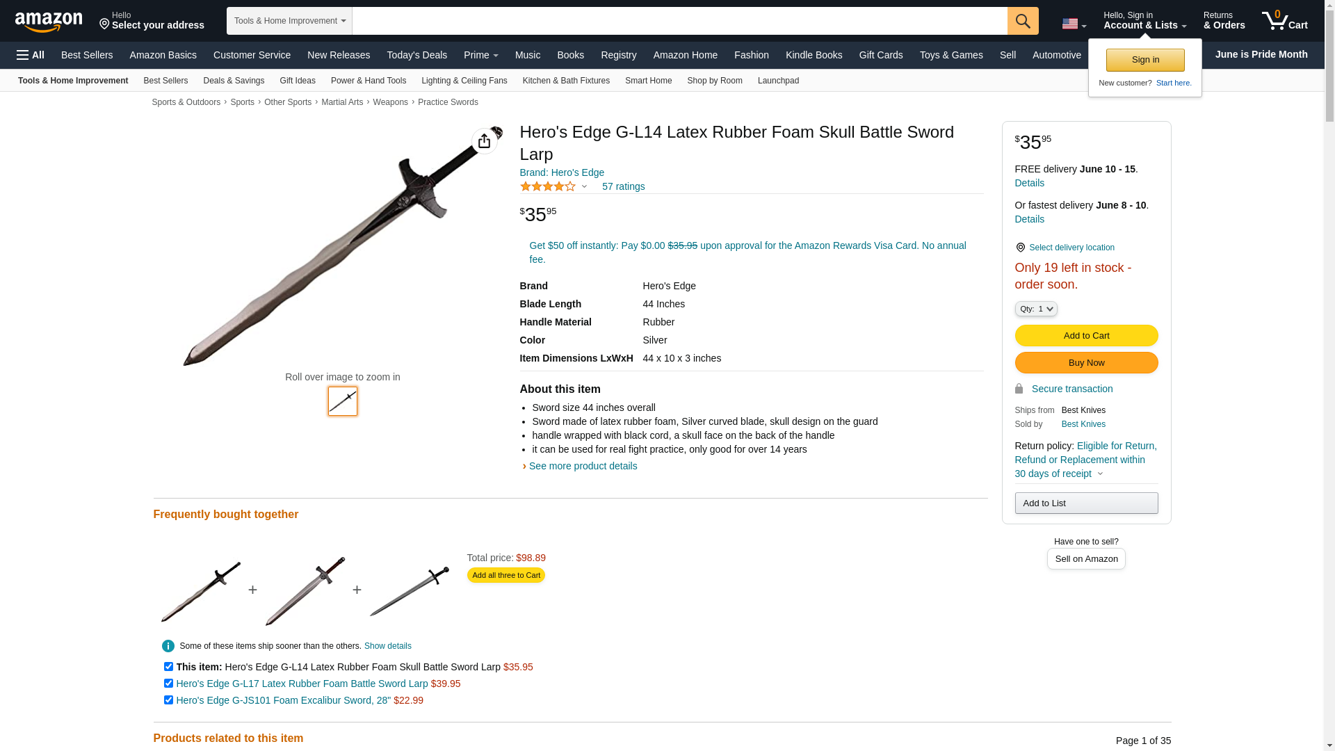 <br /> <b>Hero's Edge Foam Skull Sword, 49":</b> <ul> <li>Inner core: fiberglass rod, polyurethane foam</li> <li>Outer material: latex</li> <li>Supports 30 pounds of weight</li> <li>US patent number: US9,211,480</li> <li>Overall length: 44.50"</li> <li>Blade length: 32.00"</li> <li>Blade width: 2.75"</li> <li>Guard width: 7.75"</li> <li>Handle length: 12.50"</li> <li>Safe, realistic and lightweight prop</li> <li>LARP (live action roleplay) enthusiast approved</li> <li>Perfect prop for costumes, cosplay and theater</li> <li>Inner core: fiberglass rod, polyurethane foam</li> <li>Outer material: latex</li> <li>Supports 30 pounds of weight</li> <li>US patent number: US9,211,480</li> <li>Age range: 8 years and up</li> </ul>