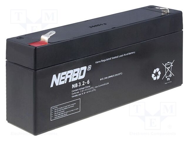 As an Amazon Associate, we earn from qualifying purchases. NERBO NB3.2-6 -AS | Re-battery: acid-lead; 6V; 3.2Ah; AGM; maintenance-free NERBO . NB3.2-6 -AS Gallery Attributes Brand name, Manufacturer name, Manufacturer, Attribute00NERBO Attribute01acid-lead Attribute026V Attribute033.2Ah Attribute04AGM Attribute05maintenance-free Attribute06134x35x61mm Attribute075 years Attribute08connectors 4,8mm Attribute09alarm systems, AttributeKey00Manufacturer AttributeKey01Type of rechargeable battery AttributeKey02Rated voltage AttributeKey03Capacity AttributeKey04Technology AttributeKey05Rechargeable batteries features AttributeKey06Body dimensions AttributeKey07Storage time AttributeKey08Leads AttributeKey09Rechargeable batteries application CategoryL1Power Sources CategoryL2Batteries, Rechargeable Batteries CategoryL3Acid Cells Extra Product NameNERBO NB3.2-6 -AS | Re-battery: acid-lead; 6V; 3.2Ah; AGM; maintenance-free atoms, moq, multiple1 jsonUrlData1f0daff9d602a3fcfec9fe1fa411b12e. jsonUrlData26909a8f37be11d9dba39 keywordsNERBO, NB3.2-6 -AS, ACCU-HP3.2-6/NB MPNNB3.2-6 -AS qtyInStock0 SKUACCU-HP3.2-6/NB snippetNERBO NB3.2-6 -AS | Re-battery: acid-lead; 6V; 3.2Ah; AGM; maintenance-fre Distributor offers SellerSKUMOQIn stockMultiplePrices TMEACCU-HP3.2-6/NB11
