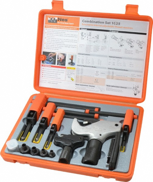 Nes combination universal thread repair set for both internal and external threads. By using Nes on a maintenance job, it increases efficiency and decreases time. The individual making the repair does not have to carry a wide arrangement of taps and dies, instead the Nes 1025 or other Nes sets will cover all the threads that need to be repaired. The Nes tool sets replace thousands of taps and dies.