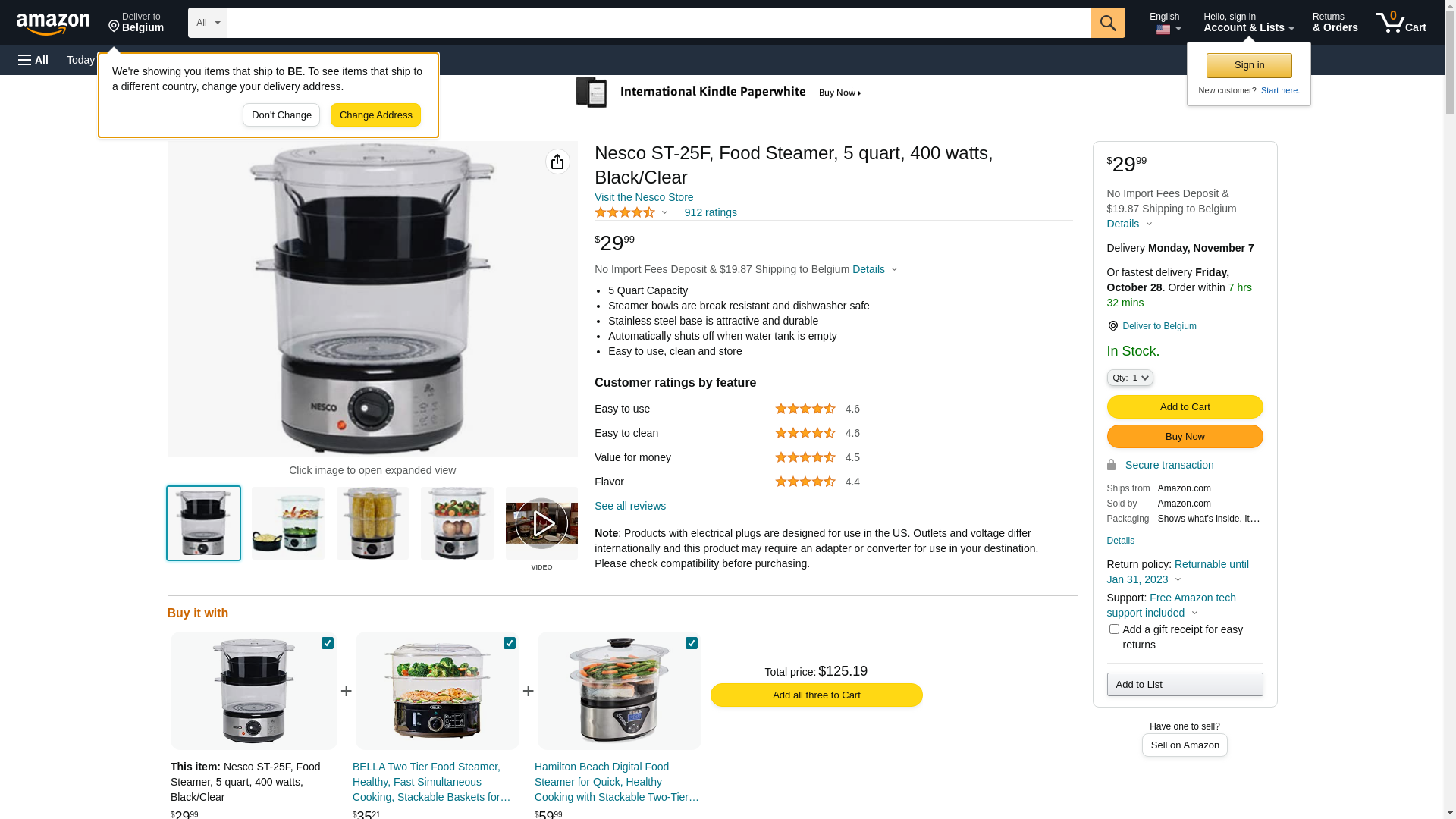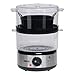 The Nesco ST25-F Steamer cooks a wide variety of foods including grains, vegetables, fruits, eggs, seafood, meat and poultry. This unit comes with a 60 minute timer and is equipped with an automatic shut-off when out of water. Provides easy preparation for all the distinct flavors and fresh tastes of steamed food with amazing convenience. Featuring 400 watts of heating power, 2 steam bowls, a 2-cup rice bowl and 0-60 minute timer. Provides the power and versatility to easily obtain the perfect cooking consistency for all of your favorite rice dishes, veggies and an almost unlimited assortment of other tasty meals. 2-cup rice bowl works great for eggs, tamales and many other steamed dishes. The Generous 5-quart bowls and 2-cup water reservoir is great for family-size portions. Monitor your food without losing steam with our durable plastic steaming trays. Attractive Stainless Steel outer body design.
