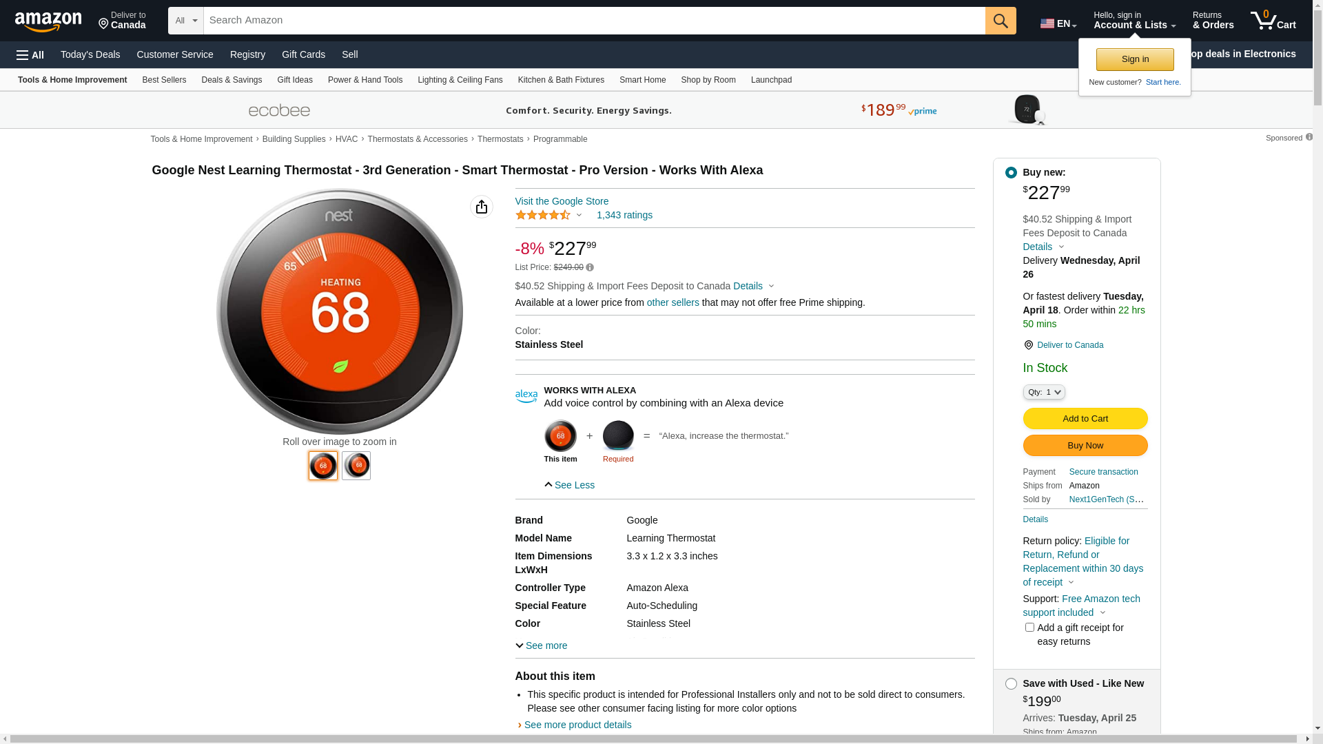 Google, T3008US, Nest Learning Thermostat, 3rd Gen, Smart Thermostat, Pro Version, Works With Alexa