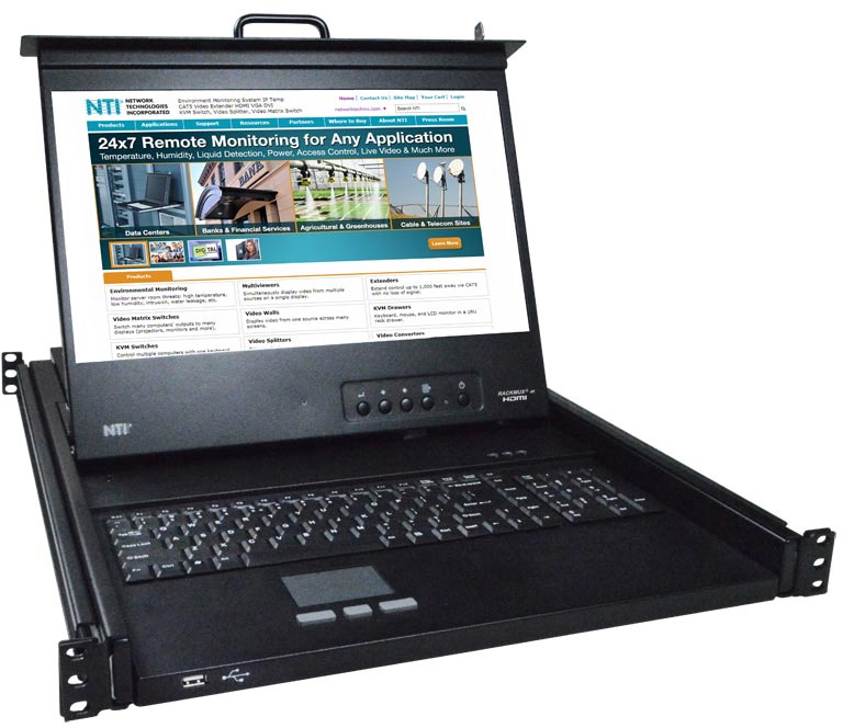 The RACKMUX 4K HDMIDisplayPort USB KVM Drawer combines a rackmount 4Kx2K LCD monitor keyboard and touchpad mouse in a spacesaving 1RU industrialstrength drawer Features. Compatible with HDMI or DisplayPort USB computers. HDMI connector supports resolutions up to 444. DisplayPort connector supports resolutions up to 444. HDMI 14 DisplayPort 12a HDCP 2214 compliant. Torquefriction hinges monitor does not wobble spring or slam shut. Compact heavyduty tactile keyboard with 17key numeric keypad. Drawer locks into place when open to prevent it from sliding in and out of the rack. Rugged steel construction with durable powder coat finish. LCD autoshutoff in closed position. Internal cable arm provides proper cable management for sliding the drawer open and closed. Equipped with On Screen Display OSD. Front panel security lock. Front panel USB port to connect an external USB device such as a flash drive. OSD controls for brightness contrast phase Horz and Vertcenter alignment zoom and color adjustment. Compatible with a USBenabled computer with HDMI or DisplayPort output. Windows 2000XPVista7810 Windows Server 200020032008201220162019 Solaris Linux FreeBSD and MAC OS 910. One female HDMI one female DisplayPort and one female USB Type B connectors. Use with an NTI KVM Switch to control multiple USB computers. Compliant with HDMI 14 DisplayPort 12a and HDCP 2214 standards. Forwardfolding 173 Active Matrix LCD flat panel display. Three button touchpad mouse. Front panel USB 20 port to connect external USB devices. Female USB Type A connector. KVM drawer must be connected to a USBenabled computer. 100key US with numeric keypadSpecifications. HDMI 40404. DisplayPort 40404. Tilt up to 120deg. Frequency up to 60Hz. Brightness 400 nits. Contrast Ratio 10001. Weight 525 lbs