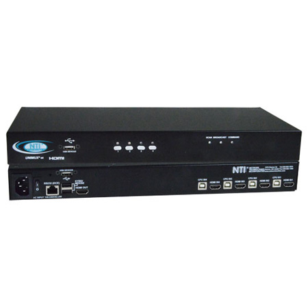 The UNIMUX HDMI USB KVM Switch allows a user to control up to 32 UltraHD 4Kx2K 30Hz USB computers with one USB keyboard USB mouse and 4K HDMI monitor Dedicated internal microprocessors emulate keyboard and mouse presence to each attached CPU 100 of the time so all computers boot errorfree Features. Supports UltraHD 4Kx2K resolutions to 3840x2160 30Hz 2K resolution 2048x1080 60Hz and HDTV resolutions to 1080p 60Hz. Features NTIs patented true autoboot USB switching all attached computers can be booted simultaneously. Compatible with USB computers PC SUN and MAC. Control the switch through the front panel buttons keyboard commands OSD or RS232. Two transparent USB 20 ports lowfullhigh speed in addition to keyboard and mouse ports for connecting. High quality steel construction. Flash upgradeable. Rackmount kit includedHosts. Female HDMIA connectors. Female USB Type B connectors. Supports USBenabled computers PC SUN and MAC with HDMI video. Multiplatform support Windows 2000XPVista7810 Windows Server 200020032008201220162019 Solaris Linux FreeBSD and MAC OS 910. Compliant with HDMI 14 and HDCP 14 standardsMonitor. Supports UltraHD 4Kx2K resolutions to 3840x2160 30Hz 2K resolution 2048x1080 60Hz and HDTV resolutions to 1080p 60Hz. One female HDMIA connector. Compliant with HDMI 14 and HDCP 14 standardsDevices. Two female USB 11 Type A connectors for keyboard and mouse. Supports fullspeed 12 Mbps or lowspeed 15 Mbps USB keyboard and mouse. Compatible with most USB keyboards and mice including USB IntelliMouser. Keyboard and mouse are hotpluggable. Supports SUN and MAC extra keys. Two transparent female USB 20 Type A connectors for additional USB devices. Supports highspeed 480 Mbps fullspeed 12 Mbps and lowspeed 15 Mbps USB devices including but not limited to touchscreens monitors CAC card readers printers scanners and thumb drivesPower. 110 or 220 VAC at 50 or 60 Hz via IEC connectorCables. Interface cables between your computers and the switch are required for proper