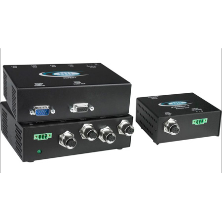 Also known as: CAT5 VGA video splitter, industrial digital signage, industrial video distribution, video multi-point extender, audio video port expander, cat5 vga splitter, monitor splitter, vga video splitter, distribute passenger information signage, light rail train video distribution, extend multiple monitors, VGA video distribution over cat 5 wiring, share video, split vga video, video splitter hub, VGA CAT5 extender.<br />The VOPEXr Industrial VGA Video Splitter/Extender simultaneously broadcasts high-resolution video from one computer to 4 or 16 remote monitors located up to 600 feet away using CAT5/5e/6 cable with M12 connectors. The robust M12 connector system is ideal for rail transportation and harsh industrial environments where reliable connections are required.</p><p><br />The VOPEX VGA video splitter/extender system has two components: the VOPEX-M12V-x VGA broadcast unit, which connects to the host computer and also supplies video to a local monitor, and an XTENDEXr ST-M12V-R-600 remote unit for each remote monitor. The units are interconnected by CAT5/5e/6 cable terminated with M12 connectors.</p>