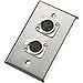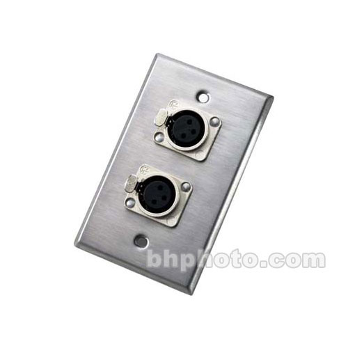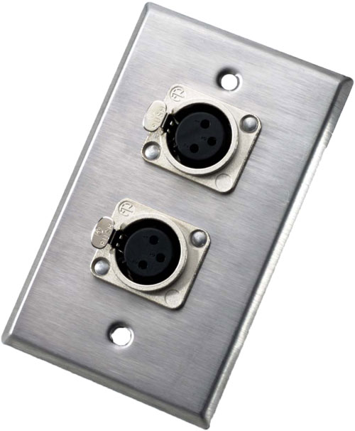 Dual gang 3 pin female D-L-1 series XLR wallplate with low glare nickel housings. Receptacles are riveted to stainless steel face plate for secure operation. Mounts on standard dual-gang electrical box or low-voltage bracket.