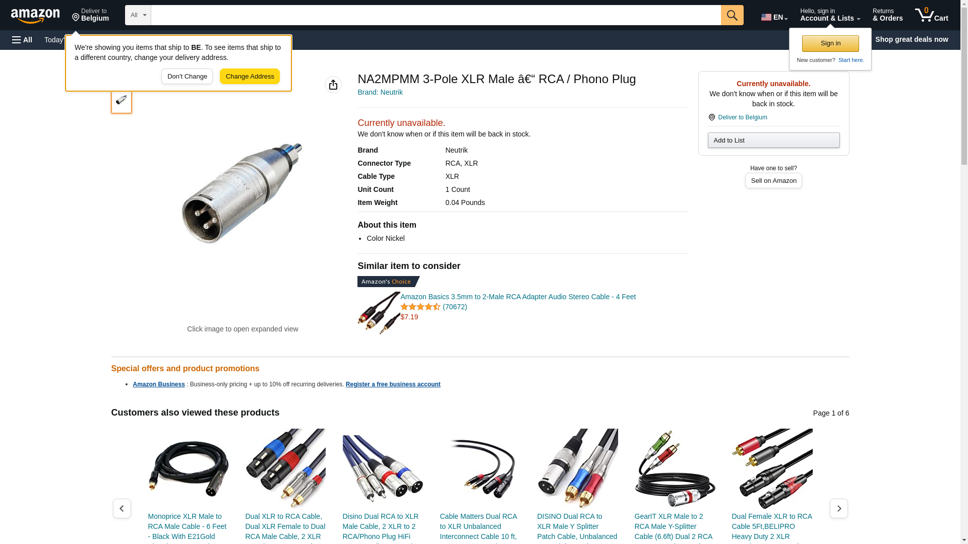 Neutrik XLR Audio Adaptor, XLR Plug, RCA/Phono Plug Rohs Compliant: Yes - NA2MPMM