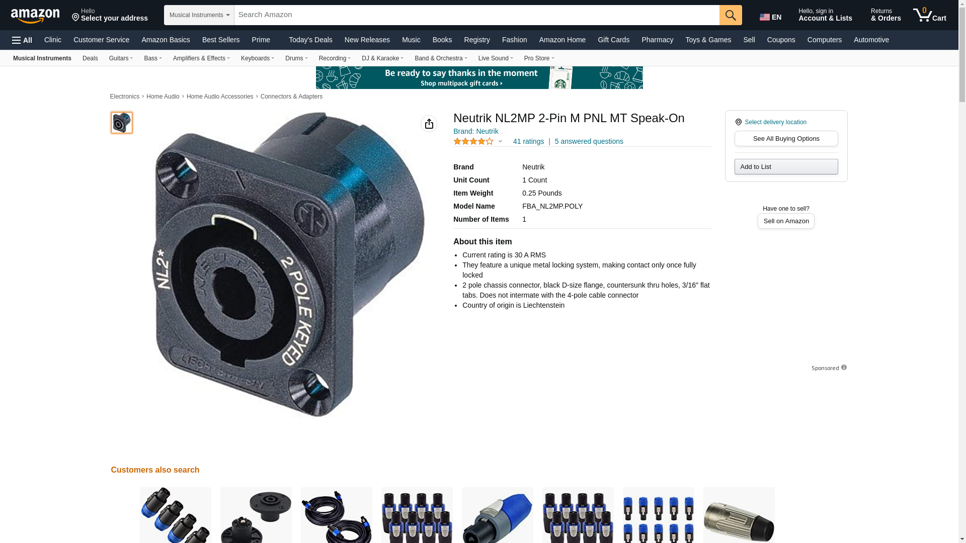 | Feature | NEUTRIK SPEAKER CONNECTOR, 2 POLE MALE |