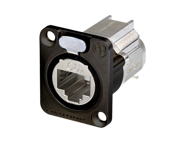 - Neutrik NE8FDX-Y6-B etherCON RJ45 jack for Cat 6A in a black D shape panel mount has IDC punch down