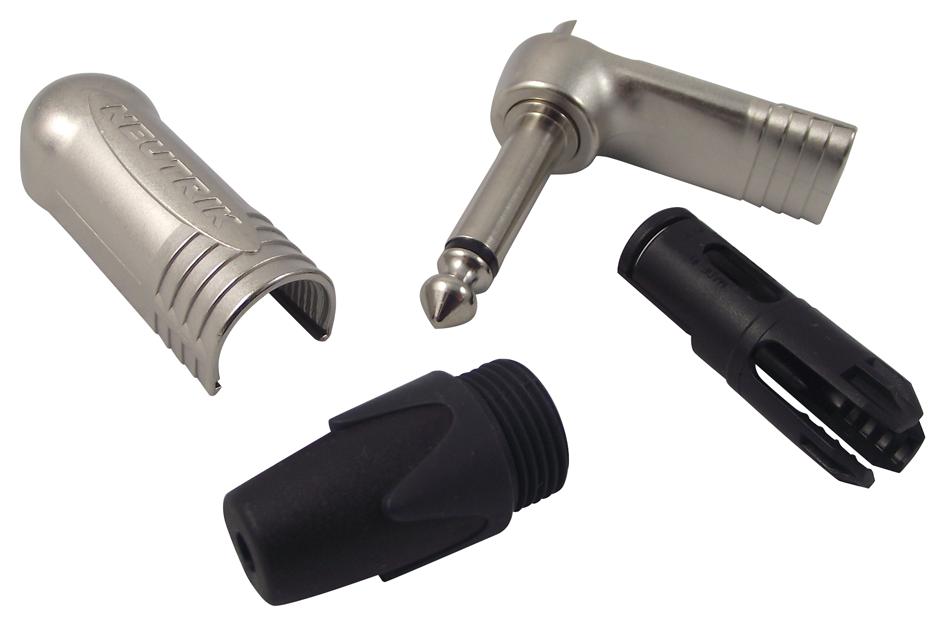 1/4" professional right-angle phone plug, 2 pole, nickel contacts, nickel shell The heavy duty professional phone plug series improves on the design of the existing C series by offering the thinnest available A-gauge 1/4" plug with unique Neutrik chuck type strain relief on the market. The slimline shell with a width of 14.5 mm meets the most recent requirements for highest density jackfields (15.88mm jack pitch). The precise machined one-piece tip contact without rivets makes it unique and avoids hook up in a socket or break off the tip. The Plug X Series serves all applications such as guitar applications, audio cables, snakes, speakers, amplifiers and mixing desks. Features & Benefits All metal housing eliminates the plastic cover of the predecessor NP*RCS and improves further durability and EMI protection Extra slim 1/4" plug for highest packing density Robust diecast shell in stylish design Proven chuck type strain relief for reliable cable retention Sleek design for best handling convenience Precision machined one-piece contacts - avoid hook up of tip contact