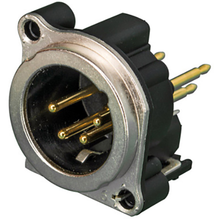 4 pole male XLR receptacle, grounding: separate ground contact to mating connector shell and front panel, vertical PCB mount.</p><p>Same as A series with exception of a metal mounting flange featuring continuous circumferential ground contact to chassis for best EMC practice. </p>