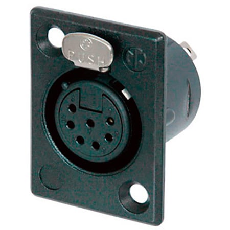 7 pole female receptacle, solder contacts, black metal housing, gold contacts </p><p>Smallest available traditional style metal panel mount connector with large solder cups for ease hard wiring.</p>