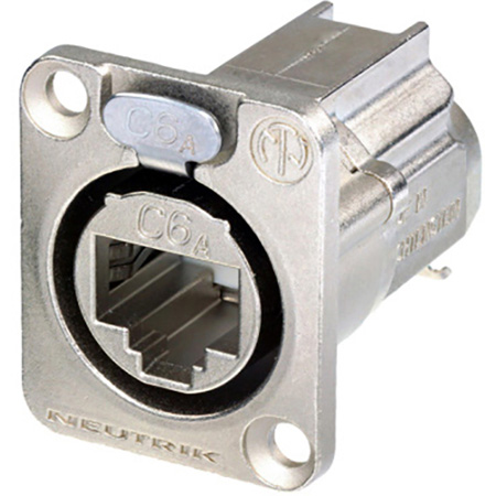 <strong>D-shape CAT6A panel connector, shielded, IDC termination, nickel housing.</strong></p><p>etherCON provides solutions for data transfer in harsh and demanding applications. These connectors are especially applicable for Ethernet networking in audio, commercial, entertainment, live stage production, DMX lighting, industrial and outdoor internet access environments. The etherCON series offers tailor-made products to suit all state-of-the art transmission classes like CAT6A, CAT6, CAT5e as well as class D according to TIA / EIA 568C.2 and ISO / EC 11801 respectively EN 50173-1 standard. The broadly based product range includes male cable carriers, assembled female receptacles, feedthrough jacks, cable couplers and shielded versions with or without illumination possibilities by LEDs. For pre-assembled RJ45 cables Neutrik offers a rugged diecast metal shell as a male cable carrier, which does not require the re-termination of the cable assembly. Female chassis receptacles are based on the well known Neutrik "A & B" series as well the "D" series of XLR receptacles with either secure latching system or push pull locking (CAT6) features not found on other RJ45 receptacles. Terminations available do include horizontal and vertical PCB mount or IDC. Ingress protection of IP 54 is achived on the CAT 5 version by assembling the waterproof sealing kit SE8FD while CAT 6 versions are IP 65 rated as standard and at the new CAT6A range it is customers choice to use the IP 65 protected receptacles or the unprotected versions.</p><p><strong>Attention! Does not intermate with CAT6 cable connectors.</strong></p>