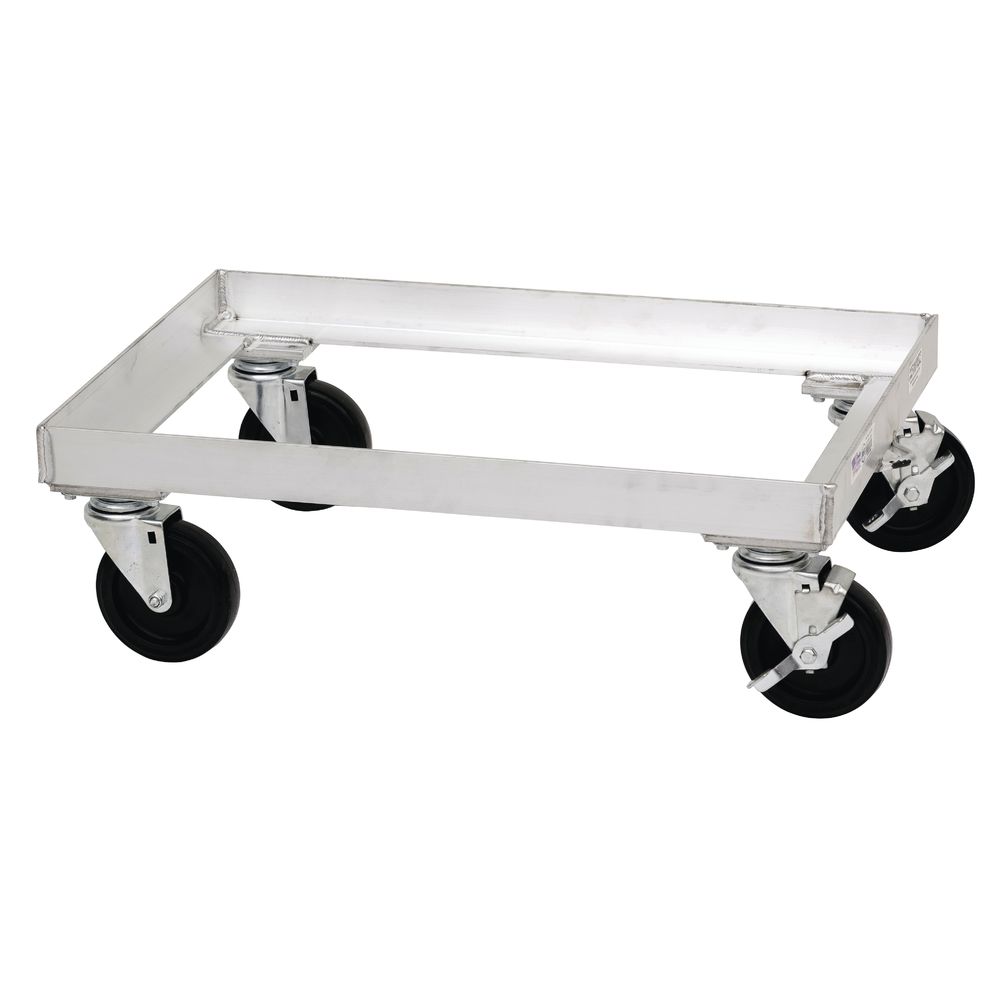 This sheet pan dolly has four heavy duty casters that make it easy to transport equipment. With two locking wheels you can rest assured that the cart will not move. This sheet pan dolly can easily handle up to 900 pounds of cooking apparatuses. The aluminum design ensures that this cart is lightweight yet very durable. This sheet pan dolly is a great choice for restaurants with little kitchen space.
