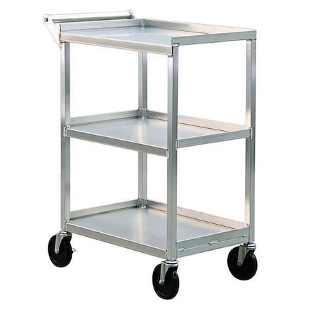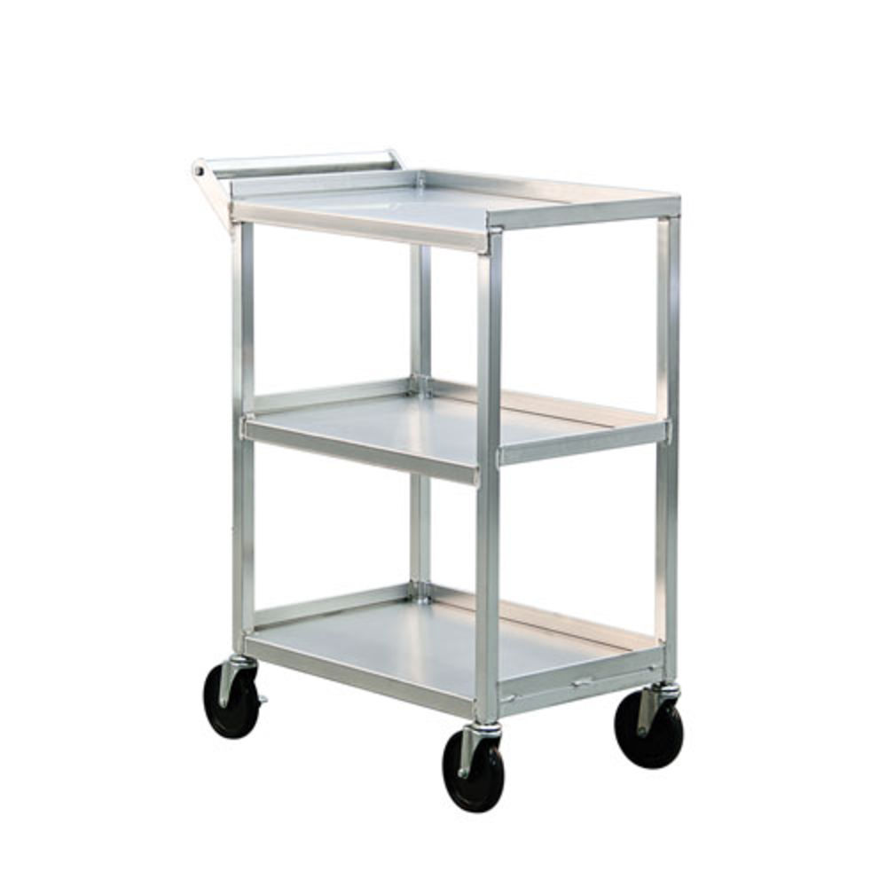 Bussing Cart, open design, (3) solid shelves, shelf size approximately 16-1/2" x 27-3/4", 13" spacing, all welded aluminum construction, aluminum tubular frame with push handle, 350 lbs. capacity, (4) 5" stem casters, (2) swivel and (2) w/brakes, NSF