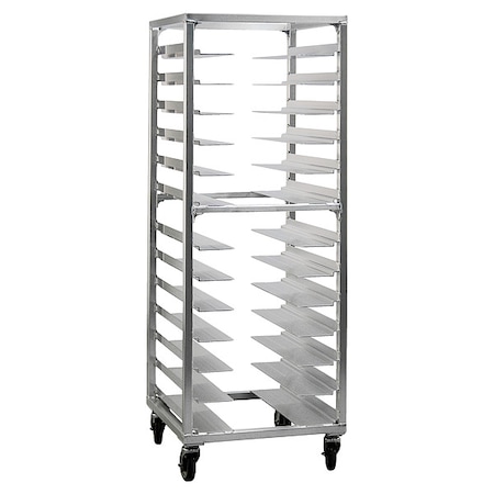 New Age's Universal Pan Rack, mobile, 24-1/2"W x 26"D x 71-1/8"H, 13-stepped-angle runners, 4-1/2" spacing, accommodates 12" x 20" to 18" x 26" pans, welded aluminum construction, end loading, 5" swivel platform casters, NSF. Lifetime warranty against rust & corrosion, 5 year construction warranty, standard.