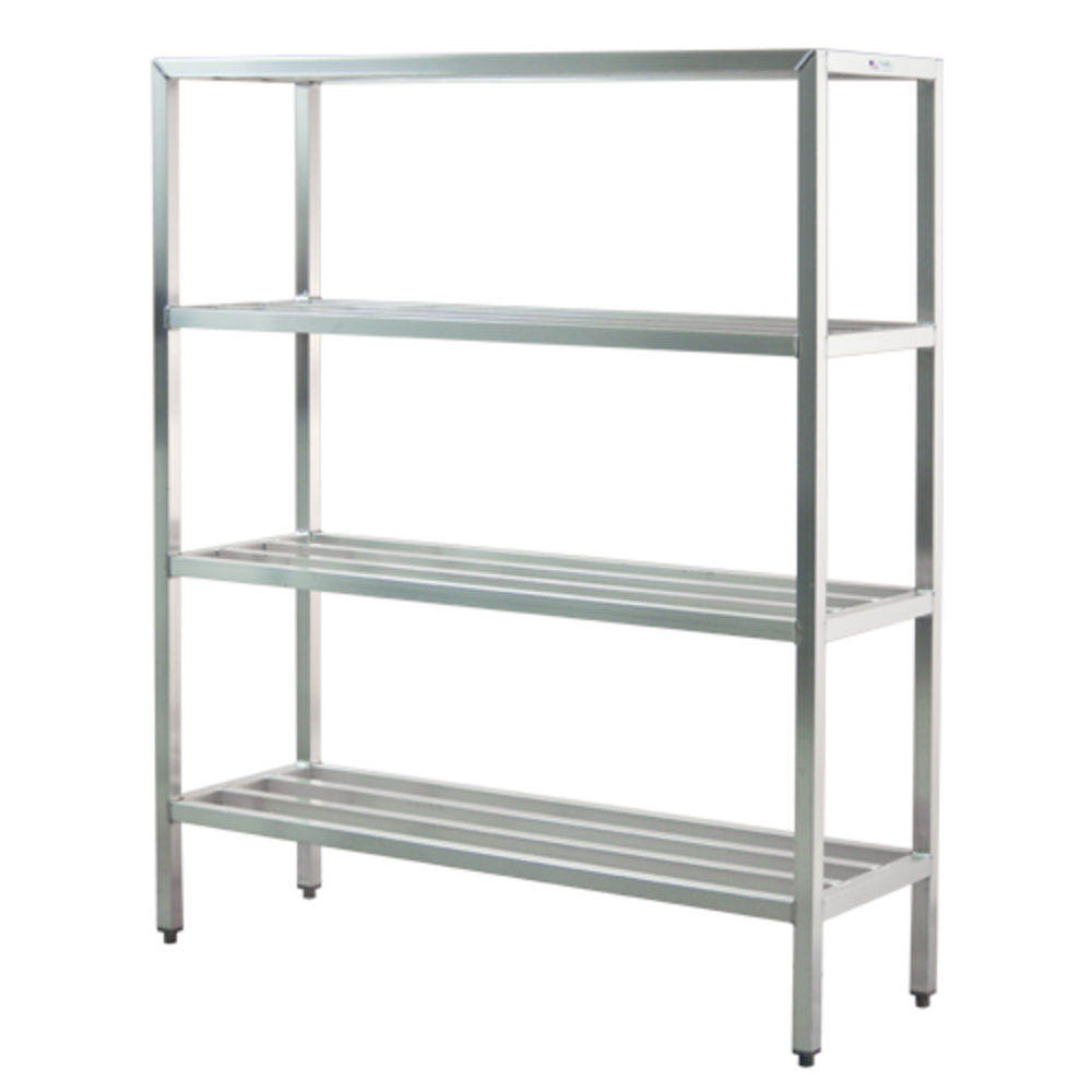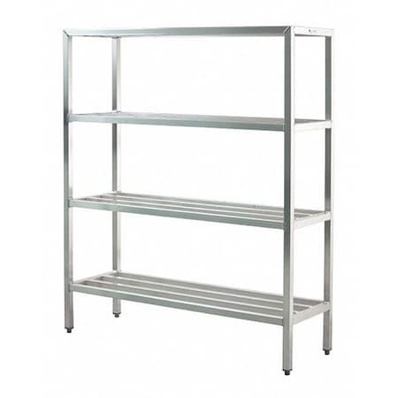 New Age Aluminum Bar Style Shelving UnitGreat shelving unit to use in backrooms or storage rooms to keep items handy and organized.Model #: 1063 Material: Aluminum Color: Silver Four shelves All welded bar style Weight capacity: 1500 per shelf NSF listed Lifetime warranty Height: 72" Width: 20" Length: 60" Spacing between shelves: 18-1/2" Made in USA 156236