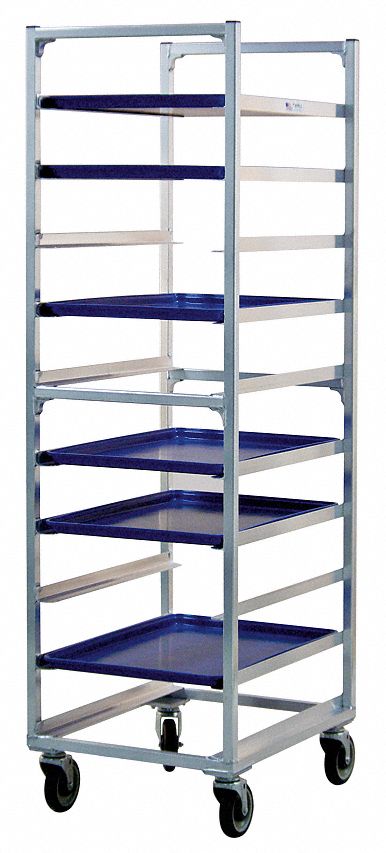Full Size Bun Pan Rack, End Loading, Load Capacity (Lb.) 700, Construction All Welded Aluminum, Temp. Rating 180, Overall Length (In.) 26, Overall Width (In.) 20-3/8, Overall Height (In.) 69-3/4, Caster Type Swivel Platform, Caster Material Polyolefin Hub, Polyurethane Tread, Tray Capacity 10, For Use With Sheet Pans