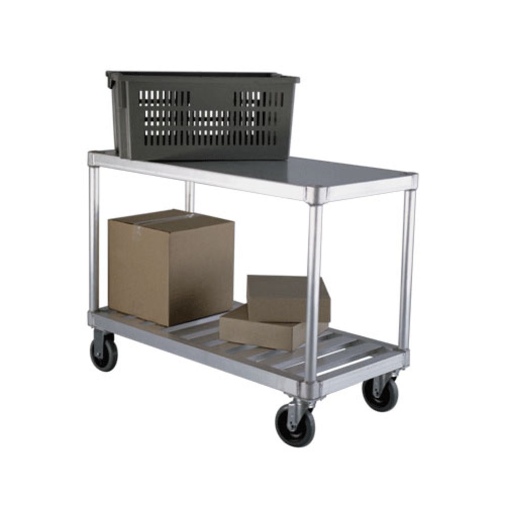 New Age's Utility Cart, (1) solid & (1) "T"-bar shelf, open base, shelf size approximately 19" x 41", 800 lbs. capacity, (4) 5" platform casters (2 swivel, 2 rigid), aluminum tubing frame, NSF. Lifetime warranty against rust & corrosion, 5 year construction warranty, standard.
