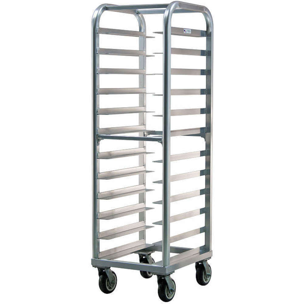 Pan Rack, Wide Angle, Load Capacity (Lb.) 1000, Construction Aluminum, Temp. Rating 140, Overall Length (In.) 26, Overall Width (In.) 21 1/2 In., Overall Height (In.) 73, Caster Type Swivel Platform, Caster Material Polyolefin Wheel, Tray Capacity 12, For Use With Sheet Pans