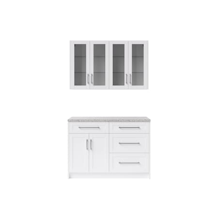 <p>Entertain in style with our fully-assembled home cabinet sets. These versatile units are ideal as a home bar, dining room serving area, media room snack station or anywhere you need convenient storage in a sleek, space-saving profile. It’s the perfect place to keep serving sets, place mats, tablecloths and decorations along with glassware and other entertaining essentials. Full-extension drawers feature premium, soft-close hinges. Thick 18mm frame construction delivers outstanding durability beneath an easy-clean surface. Available in your choice of White or Gray matte finishes to complement any décor. Cabinet organizers and accessories sold separately.</p> <p> <ul> <li>Set Includes : 2 x 24 in. Two Glass Door Wall Cabinet, 1 x 24 in. Two Door, Single Drawer Cabinet, 1 x 24 in. Three Drawer Cabinet, 2 x Wall Cabinet Side Panel, 2 x Base Cabinet Side Panel, 1 x 48 in. White Pearl Granite Countertop Extended, 6 x Contemporary Small Handle - Brushed Nickel, 4 x Contemporary Large Handle - Brushed Nickel, 1 x Door Handle Template, 1 x Drawer Handle Template, 1 x 48 in. Toe Kick (Small), 1 x 48 in. Cabinet Hanger Wall Rail (Small)</li> <li>Cabinets, counter tops, handles and millwork included</li> <li>19mm MDF single piece construction door and drawer with premium paint</li> <li>Pre-assembled, quick and easy to install</li> </ul> </p>