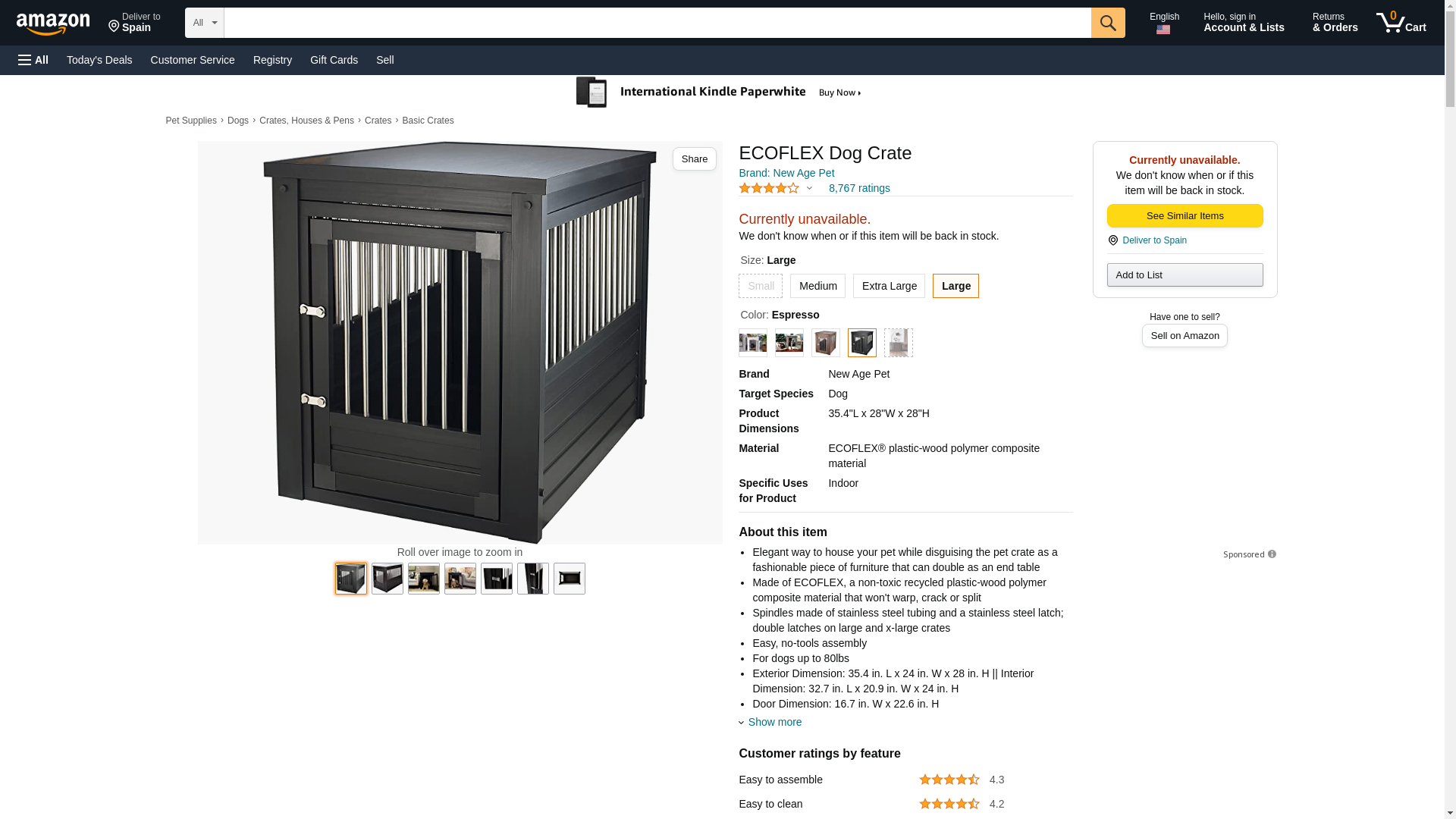New Age Pet ecoFLEX Habitat 'n Home Espresso Dog Crate with Metal Spindles The ecoFLEX Habitat 'n Home InnPlace Dog Crate is the perfect crate for your pet while they are indoors. This stylish crate can pull double duty as an end table. It is made of durable non-toxic materials and is maintenance free as it will not crack, warp, or absorb moisture. This easy to assemble crate is available in four sizes to accommodate all dog sizes. Features: Extremely easy to clean Chew-proof stainless steel spindles Beautifully integrates into any home decor ecoFLEX material is made from recycled polymers and reclaimed wood Large and X-Large models have a double latch for added security 10 Year Manufacturer's Warranty Item Specifications: Color: Espresso Sizes: Small: Exterior: 23.8"L x 18.1"W x 22"H Interior: 20.9"L x 15"W x 17.7"H Door: 11"W x 16"H Recommended Pet Size: up to 20lbs Medium: Exterior: 29.5"L x 21.1"W x 25.2"H Interior: 26.8"L x 17.7"W x 20.9"H Door: 13.8"W x 19"H Recommended Pet Size: up to 50lbs Large: Exterior: 35.4"L x 24"W x 28"H Interior: 32.7"L x 20.9"W x 24"H Door: 16.6"W x 22"H Recommended Pet Size: up to 80lbs X-Large: Exterior: 42.5"L x 27.6"W x 30.9"H Interior: 39.8"L x 24.6"W x 29.1"H Door: 20"L x 25"H Recommended Pet Size: up to 100lbs