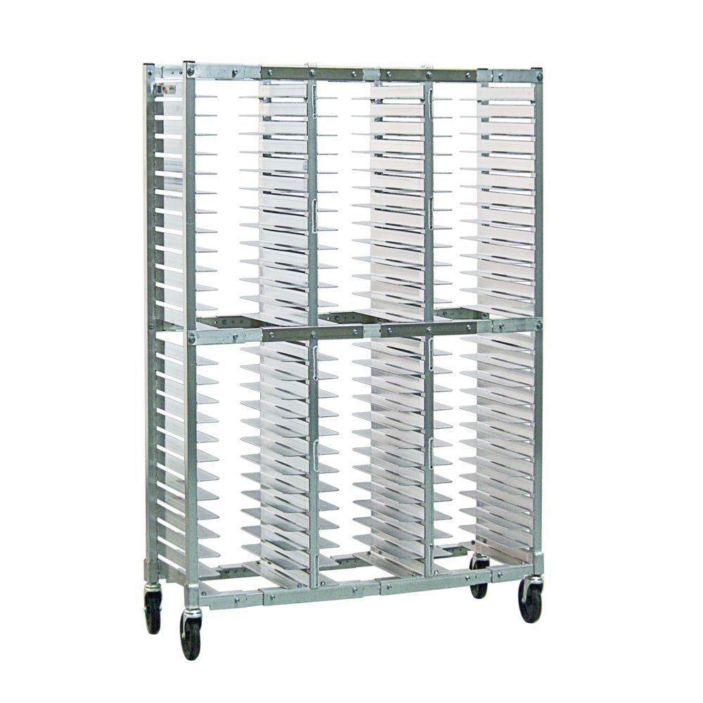Pizza Pan Rack, mobile, full height, open sides, adjustable widths in 1" increments to hold 10" through 16" pans, 2" spacing, 3 wide/2 high, 78 pan cap., aluminum construction, front & end loading, (4) 5" stem swivel casters