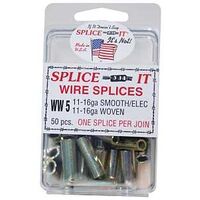 Joins, mends and repairs all fence wire easily. One splice per join. For a secure and permanent rust resistant connection. No. GB5 for 15-1/2 ga hi-tensile "Gaucho" barbed wire. No. LBW1 and LBW5 for 12.5 ga barbed, 9 ga smooth wire. No. SS5 - For 12.5 ga hi-tensile smooth, woven fence. No. ST5 for 12.5 ga hi-tensile smooth, woven fence. Stainless steel. No. WW5 for 10 to 16 ga smooth, electric, woven fence. Use only with Splice-It Crimp 'n Cut Tool No. (663.6252).