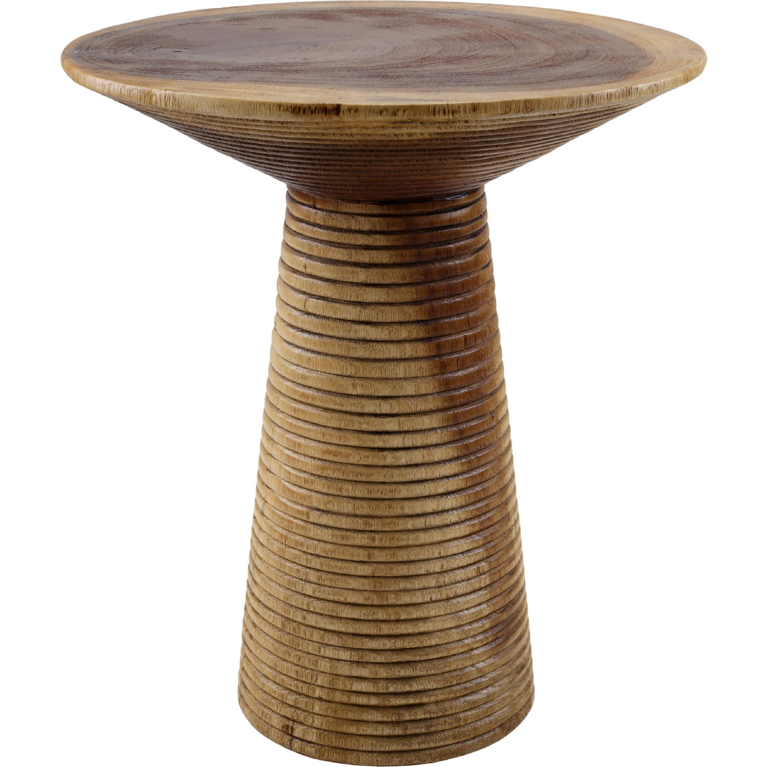 - Bringing the natural element as the focal point in this side/end table. Skilled hands crafted the work-of-art made of solid Trembesi Wood. Round top on pedestal style base offers elegance for the interior décor, expect slight variation in each piece.